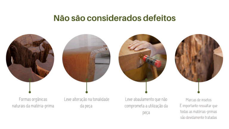Essas possíveis alterações não afetam a qualidade nem a beleza do seu produto, mas realçam seu valor como peça única, destacando sua característica orgânica e a singularidade da sua árvore originária.