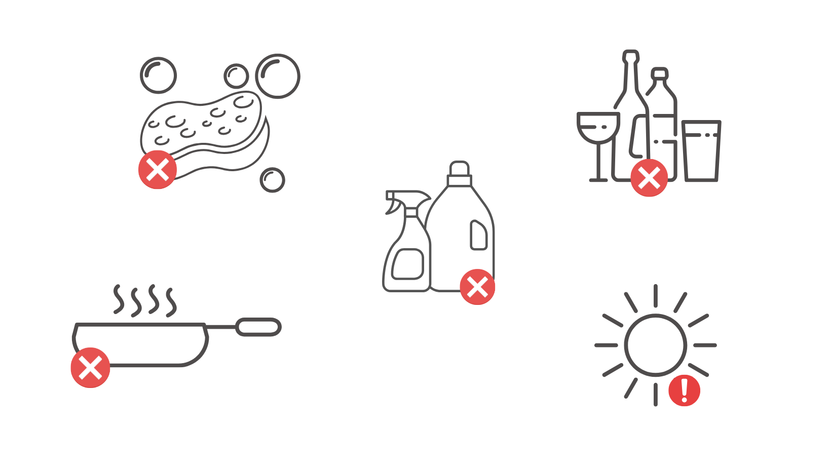 * Não utilizar produtos abrasivos como: sabão, esponja, palha de aço, etc; * Não utilize lustra móveis, óleo de peroba, produtos a base de cloro, álcool ou qualquer tipo de desinfetante ou removedor. O uso destes produtos invalida a garantia da peça; * Evite deixar objetos molhados, como copos, taças e jarras, ou objetos quentes, como panelas e travessas, diretamente sobre a peça por um longo período. Alguns produtos como vinho e molhos podem manchar a madeira. Caso apareçam manchas, realize a manutenção da peça conforme indicado na próxima seção * Evite expor o móvel ao sol, pois este reduz a durabilidade do acabamento, causa mudança de coloração e textura da peça. Peças expostas ao tempo necessitam de manutenção mais frequente * Evite deixar a madeira em contato direto com superfícies que não a deixam respirar, como vidros e plásticos. Bases que serão utilizadas com tampo de vidro é importante o uso adequado do silicone (4mm de espessura), para criar um espaço entre as peças para a madeira respirar